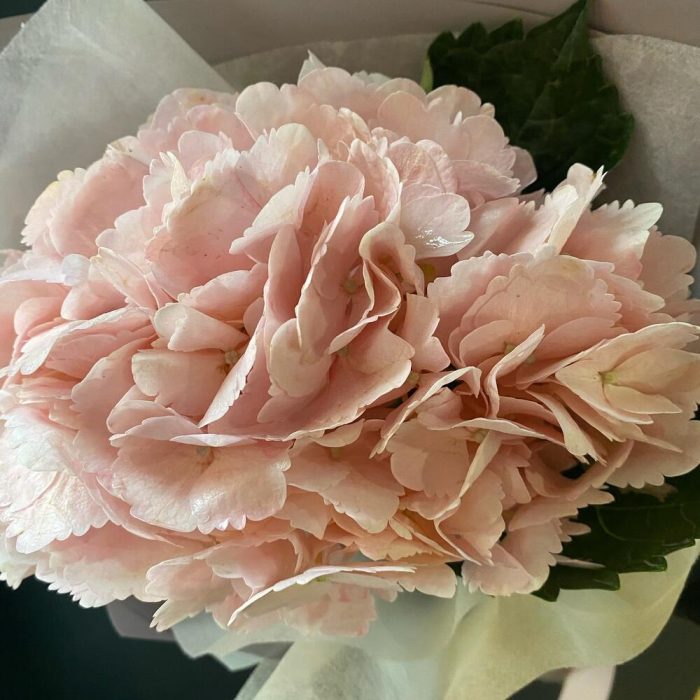 Гортензия очень любит воду и влажность, поэтому воды должно быть налито вплоть до листьев у соцветий. Стебель нужно разрезать секатором/ножом на 2-3 части. Раз в 2 дня подрезайте стебель на 1 см и опрыскивайте соцветия водой,гортензия очень водолюбивая.Не ставьте гортензии под прямые солнечные лучи и в очень жарком месте ( например, у батареи, крайне противопоказано любым срезанным цветам). Лучше поставить в какое нибудь прохладное место, или например на ночь приоткрывать окно.Букет оформлен в корейском стиле,что придает необычный образ букету.