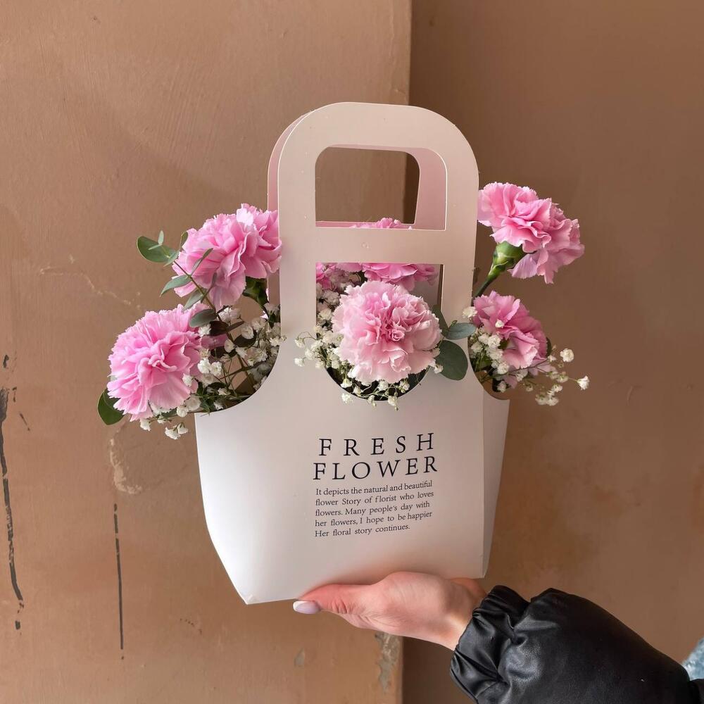 Цвет гвоздик может отличаться от фотоРекомендации по уходу:- цветы находятся во флористической губке, которую необходимо поливать 1 раз в 2-3 дня;- тонкой струёй воды в центре композиции, не попадая на цветы;- держать вдали от отопительных приборов и кондиционеров.