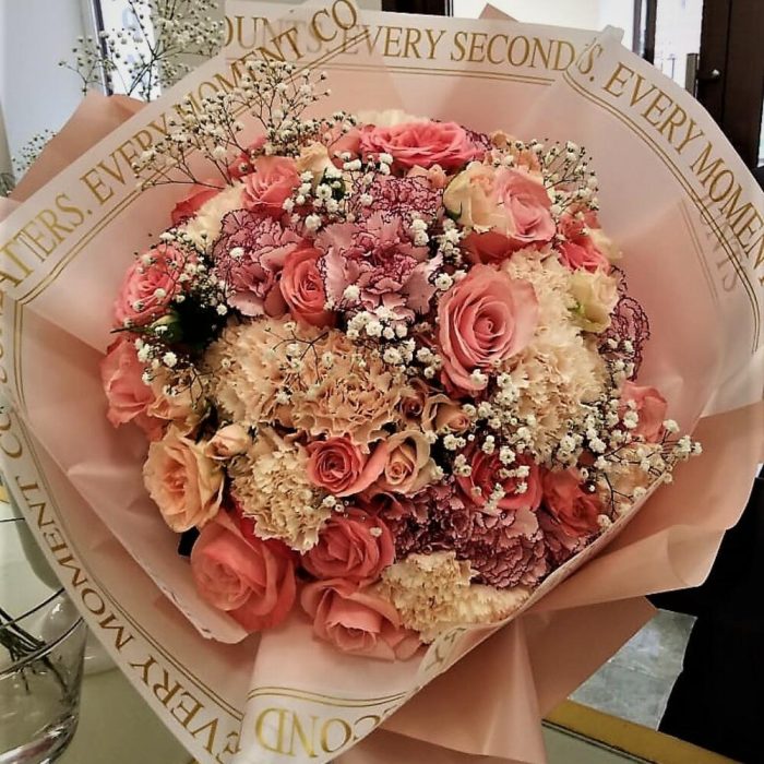 Роза – 21 шт.Гвоздика – 26 шт.Бумага – 6 шт.Лента – 1 шт.