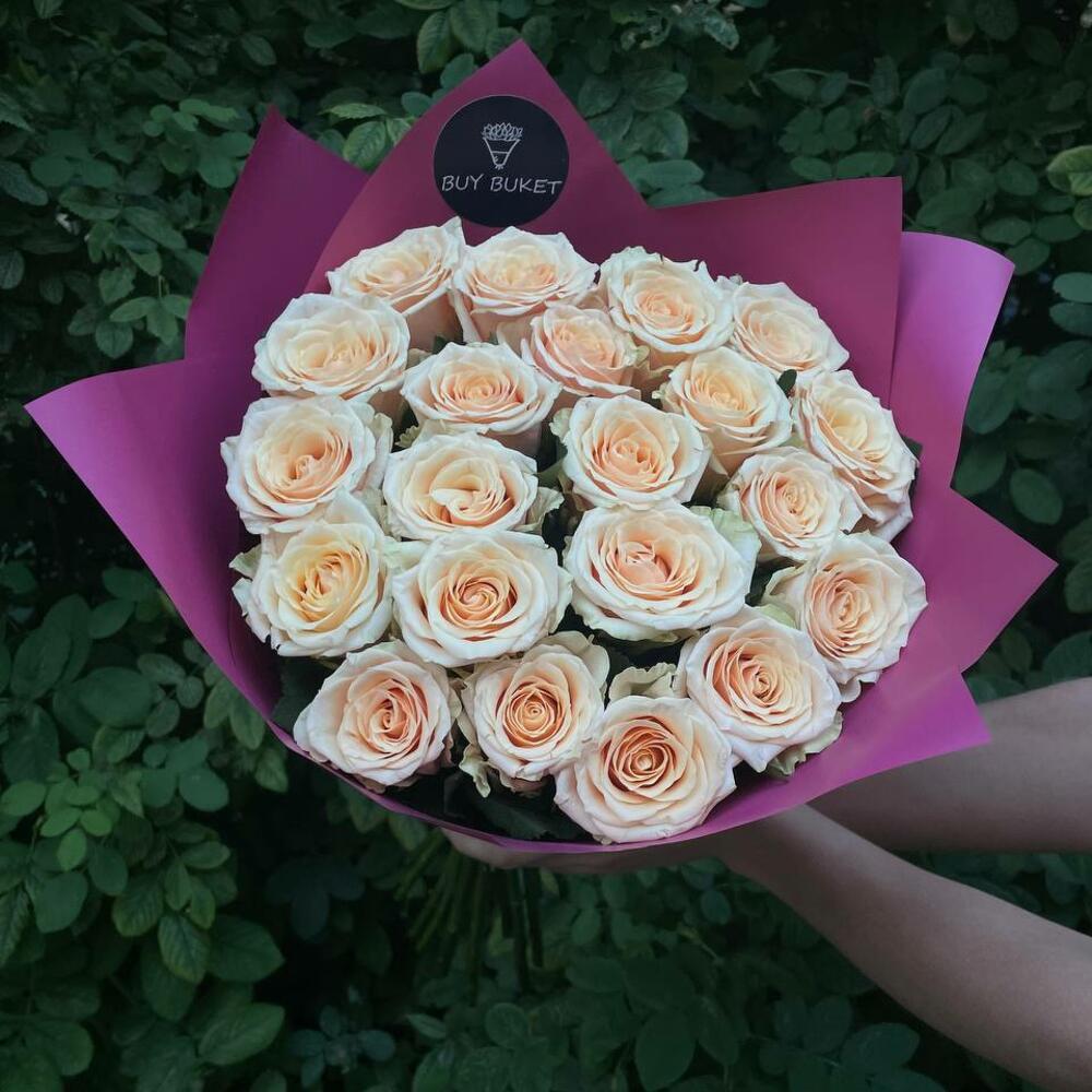 Лента атласная – 1 шт.Упаковка дизайнерская – 2 шт.Кремовая роза – 21 шт.
