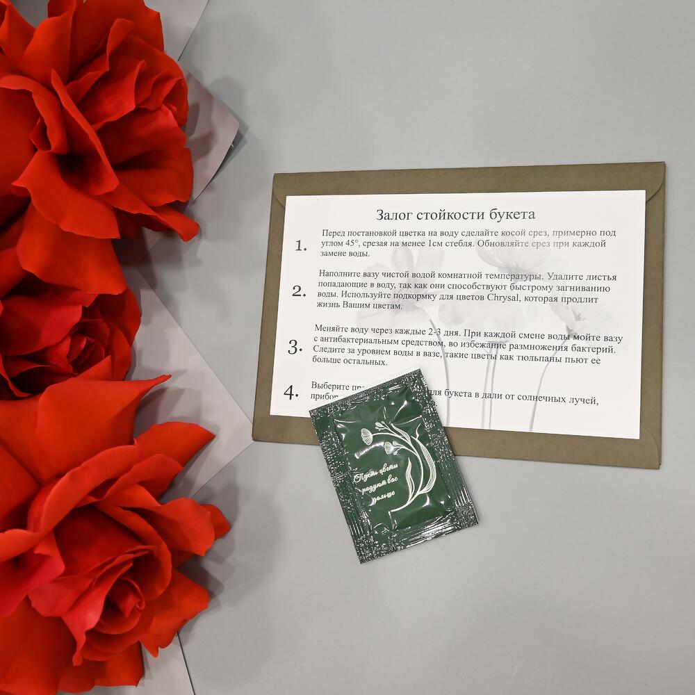 - Сроки возврата: Претензии по качеству букета принимаются в течение 24 часов с момента его получения.