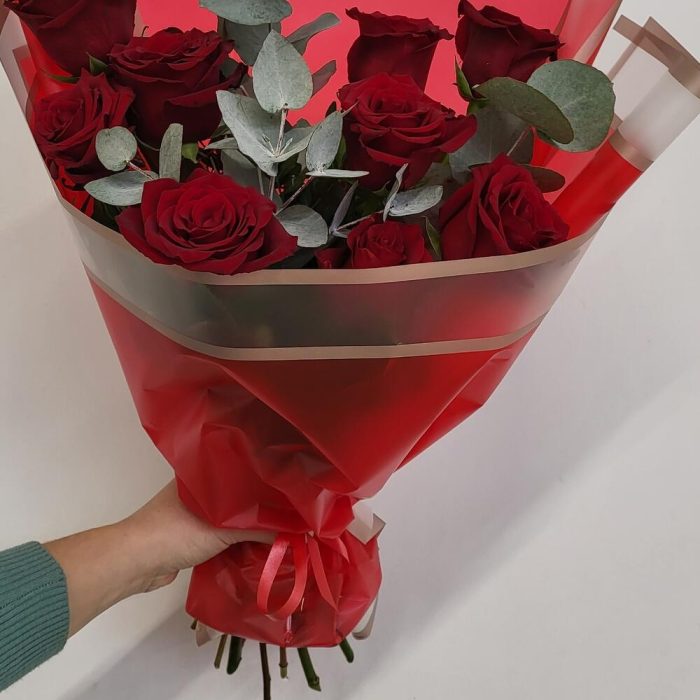 Роза красная – 9 шт.Эвкалипт – 2 шт.Упаковка дизайнерская – 1 шт.