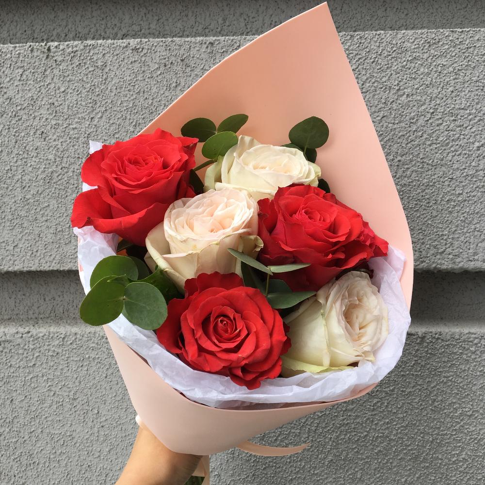 Роза белая 50 см – 3 шт.Роза красная 50 см – 4 шт.Эвкалипт – 3 шт.Упаковка фоамиран – 1 шт.Лента атласная – 1 шт.