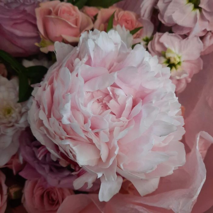 Гортензия – 1 шт.Пион Сара Бернар – 1 шт.Роза пионовидная – 3 шт.Роза кустовая – 3 шт.Альстромерия – 3 шт.Маттиола – 2 шт.Фисташка – 3 шт.Упаковка дизайнерская – 1 шт.