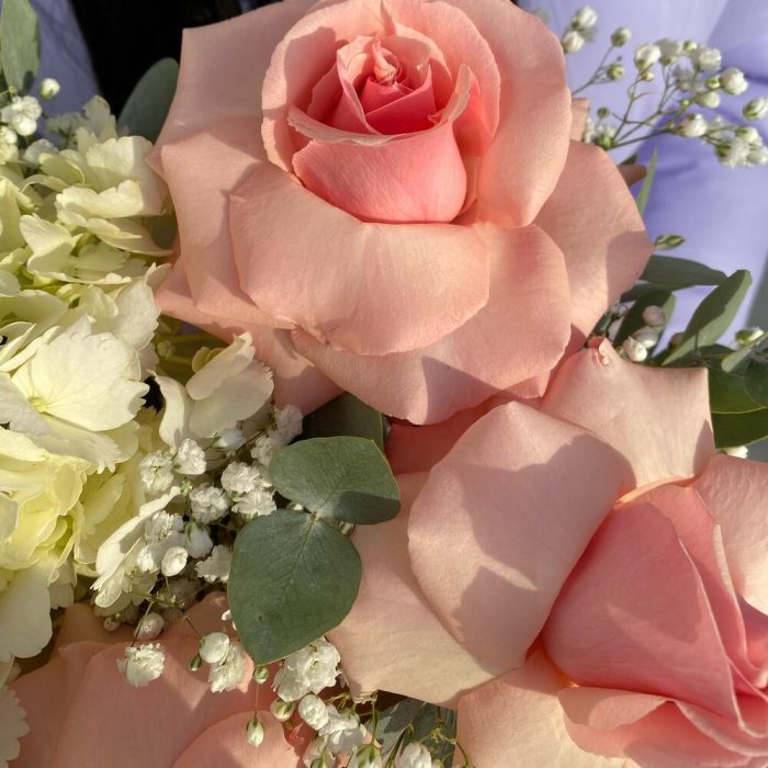Гипсофила – 2 шт.Гортензия – 1 шт.Тишью – 1 шт.Коробка шляпная – 1 шт.Оазис флористический – 1 шт.Роза pink mondial – 3 шт.