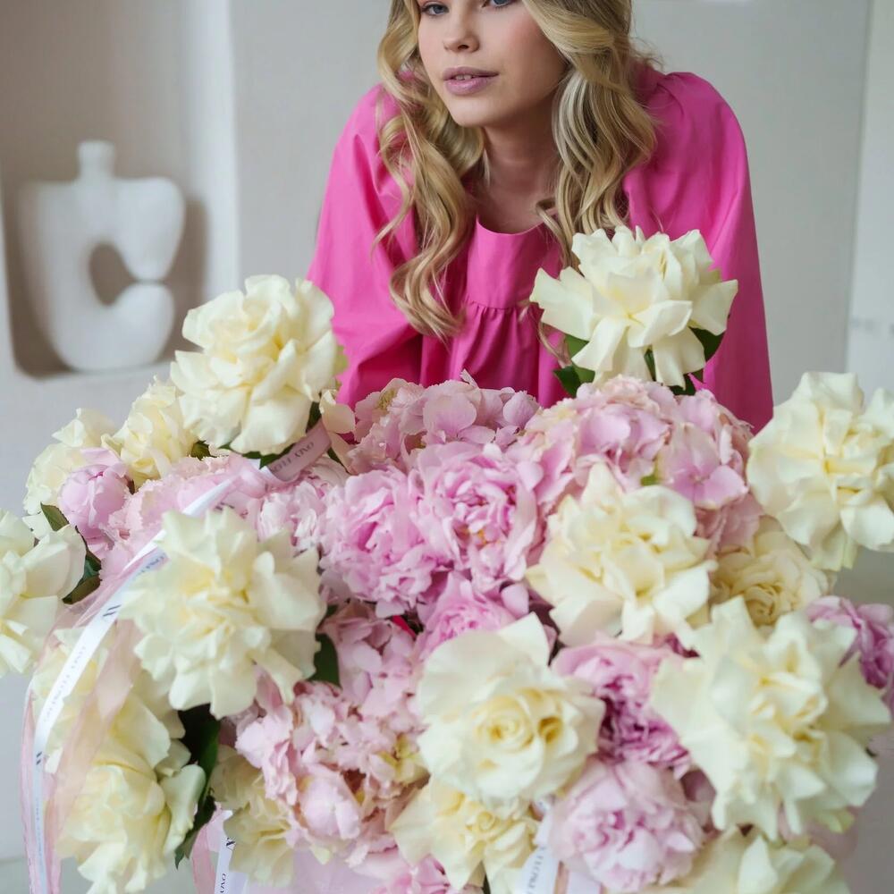Гортензия – 10 шт.Пион – 30 шт.Шляпная коробка с лентами – 1 шт.Открыточка с вашими пожеланиями – 1 шт.Роза mondial – 35 шт.Оазис флористический – 4 шт.