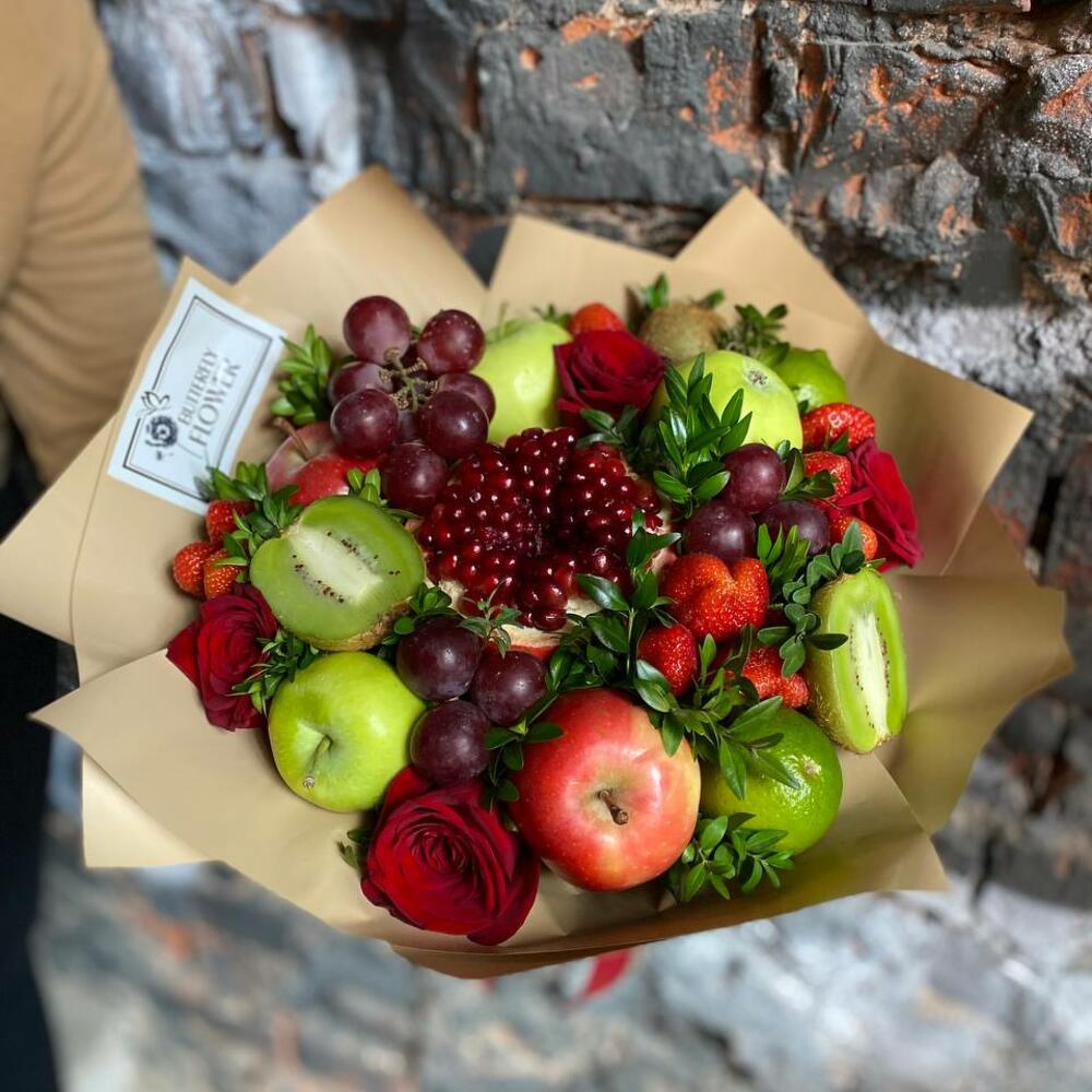 Насыщенный яркий букет из свежих цветов и фруктов премиум-качества, это настоящая находка для тех, кто хочет сделать праздник незабываемым