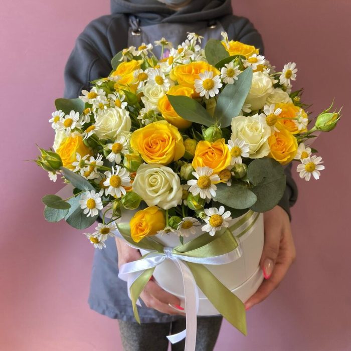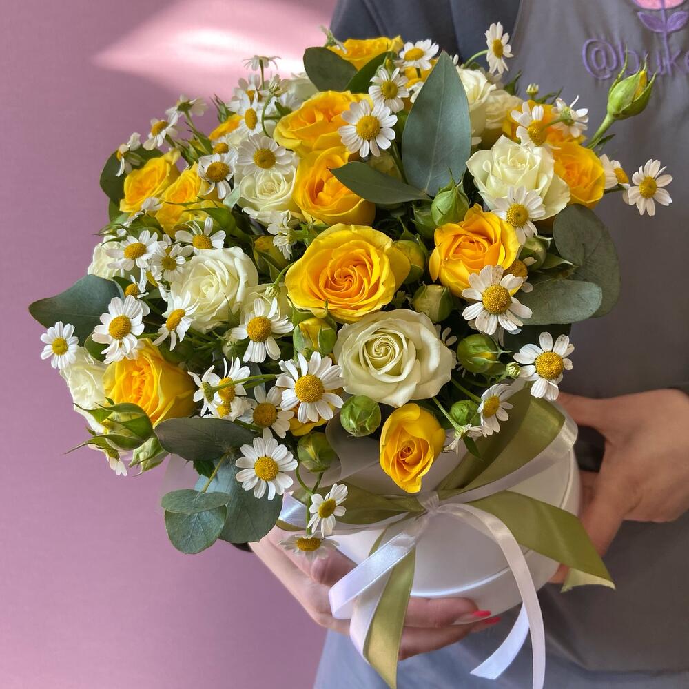 Коробка шляпная – 1 шт.Роза кустовая – 4 шт.Матрикария – 2 шт.Эвкалипт – 2 шт.бант атласный – 1 шт.